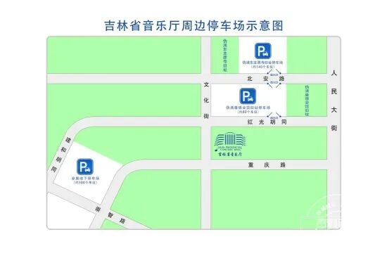 吉林省音乐厅坐落于长春市朝阳区重庆路与文化街交汇处,建议观众优先绿色出行,地铁1号线人民广场站步行可达,也可搭乘6路、306路等公交前往,周边多个停车场可满足自驾需求。