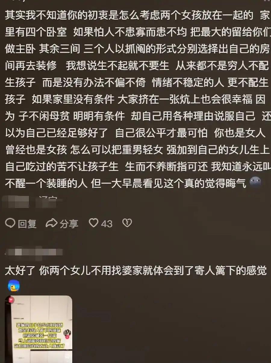 这种分配方案让网友们直呼“离谱”。有网友算了一笔账:“四个卧室,两个女儿共用一间,儿子独占一间,那另外两间呢?是给客人准备的,还是空着等升值?”