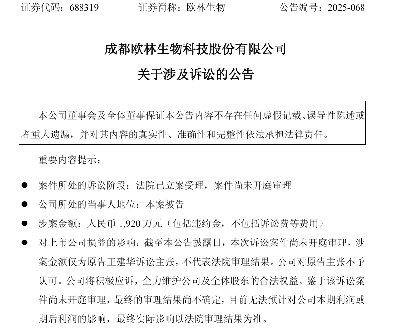 12月30日,欧林生物发布公告披露一起诉讼案件。公告显示,欧林生物于近日收到四川省成都市中级人民法院送达的《应诉通知书》及相关材料,公司为该案件的被告,涉案金额达1920万元。目前,法院已对该案立案受理,案件尚未进入开庭审理阶段。