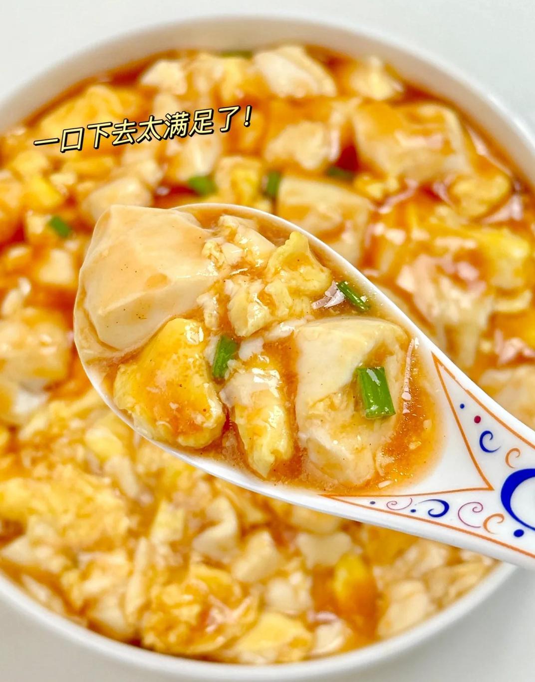 鸡蛋蓬松柔软,像被子一样“抱”着滑嫩的豆腐。