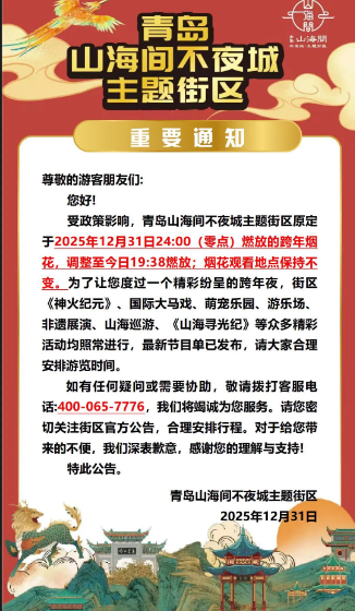 同日,青岛山海间不夜城主题街区也宣布烟花调整方案:原定于24:00燃放的跨年烟花,提前至当日19:38上演,观看地点保持不变。为丰富游客体验,街区《神火纪元》实景演出、国际大马戏、非遗展演、山海巡游等多项特色活动均正常推进,最新节目单已正式发布,方便游客规划行程。