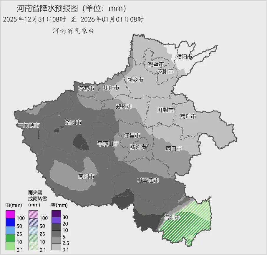 今天(31日)夜里,全省阴天,三门峡、洛阳、郑州、平顶山、许昌、漯河、南阳有中到大雪,局部暴雪;黄河以北和开封、商丘有小到中雪,山区局部有大雪;周口、驻马店、信阳小雨或雨夹雪转中到大雪,局部暴雪。全省东北风4级左右,阵风7级左右。