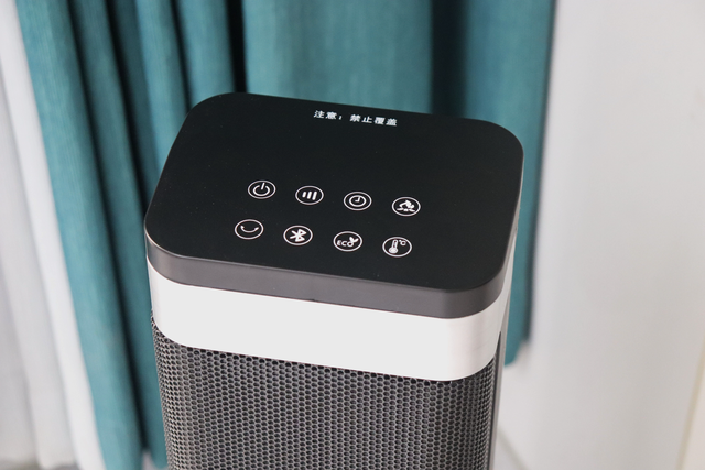 顶部设有实体按键区,涵盖电源、风速档位、定时、摇头、ECO模式、炭火模拟、蓝牙连接及温度调节等常用功能;正面还隐藏了一块LED屏,轻触即显当前室温,操作界面非常简洁。