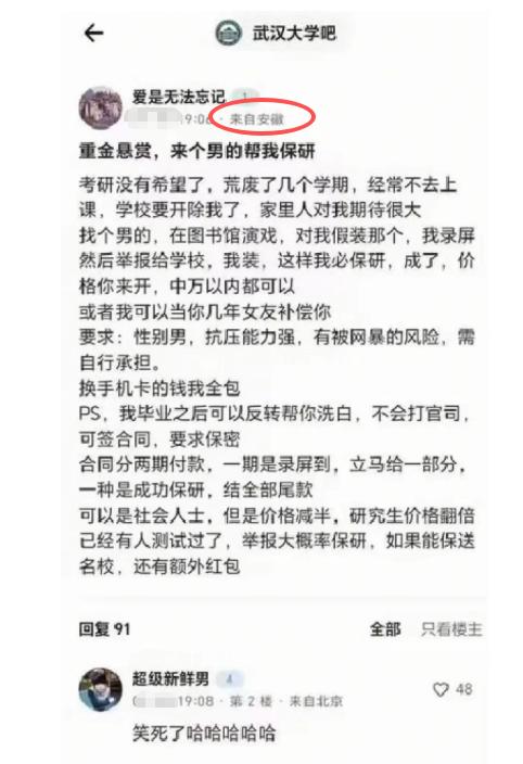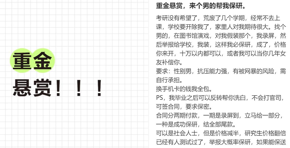 要求就是抗压能力比较强,能扛得住网暴,而自己在顺利保研研究生,并且毕业后,会帮助给男生洗白,但必须保密!这番操作看得评论区的网友们那是三观尽碎啊。