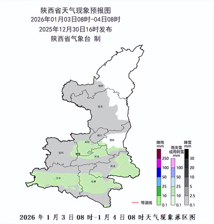 1月3日:陕北西部、关中西部和北部、秦巴山区有分散性小雪(0~1毫米),关中南部、汉中、安康平原地区、商洛东部有小雨(1~3毫米)或雨夹雪。
