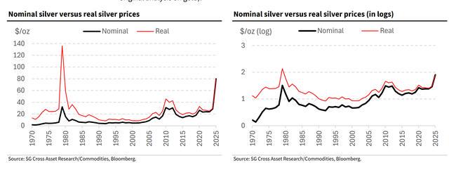 分析师表示,从标准的线性尺度来看,白银价格看起来很贵,但从对数尺度来看,价格走势揭示了过去25年来一直在形成的复合趋势。