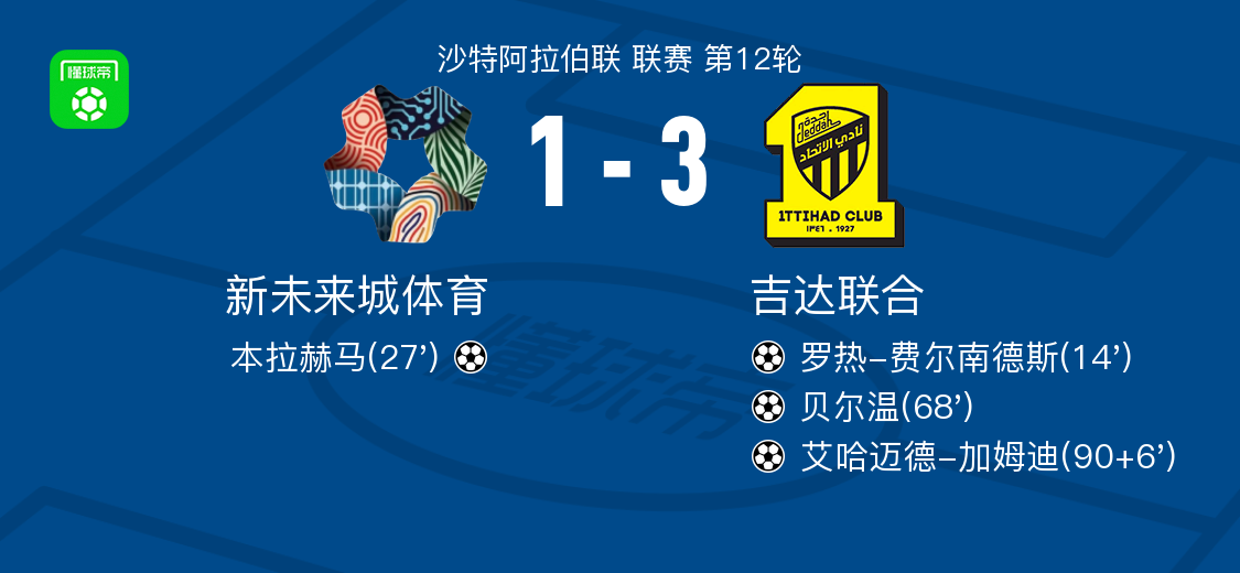 北京时间12月31日,沙特阿拉伯职业联赛第12轮展开争夺,新未来城体育坐镇主场迎战吉达联合。比赛中,吉达联合率先打破僵局,贝尔温送出助攻,罗热-费尔南德斯破门得分。随后新未来城体育迅速回应,本拉赫马成功破门,将比分扳平。易边再战,吉达联合由穆萨-迪亚比助攻贝尔温取得进球,再度拉开比分。临近结束前,萨利赫-谢赫里送出关键助攻,艾哈迈德-加姆迪破门锁定胜局。最终全场比赛结束,新未来城体育1-3不敌吉达联合。