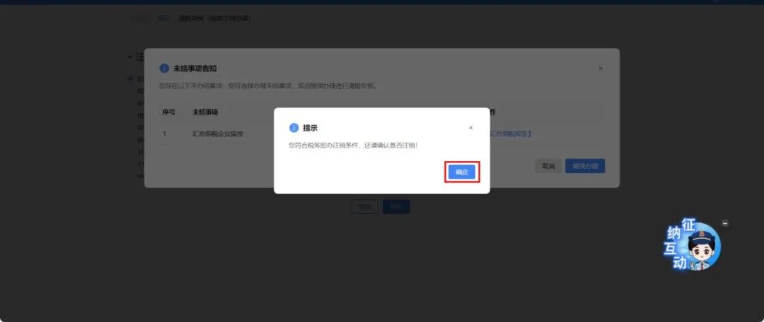 ②系统提示“您符合税务即办注销条件,还请确认是否注销!”,点击【确认】。