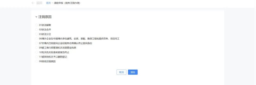 (1)注销原因为【01依法解散】、【06境外企业在中国境内承包建筑、安装、装配、勘探工程和提供劳务,项目完工】、【07非境内注册居民企业经税务总局确认终止居民身份】、【09被工商行政管理机关吊销营业执照】、【11被其他机关予以撤销登记】、【99其他注销原因】时。点击【预检】。