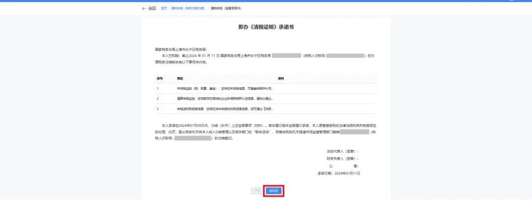 系统跳转即办《清税证明》承诺书界面,点击【去认证】。