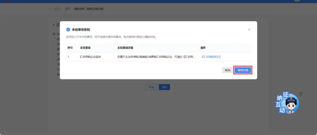 ①弹出未结事项告知界面,系统提示“您存在以下未办结事项:您可选择办理未结事项,或点继续办理进行清税申报。”,展示未结事项以及对应办理链接按钮,点击【继续办理】。