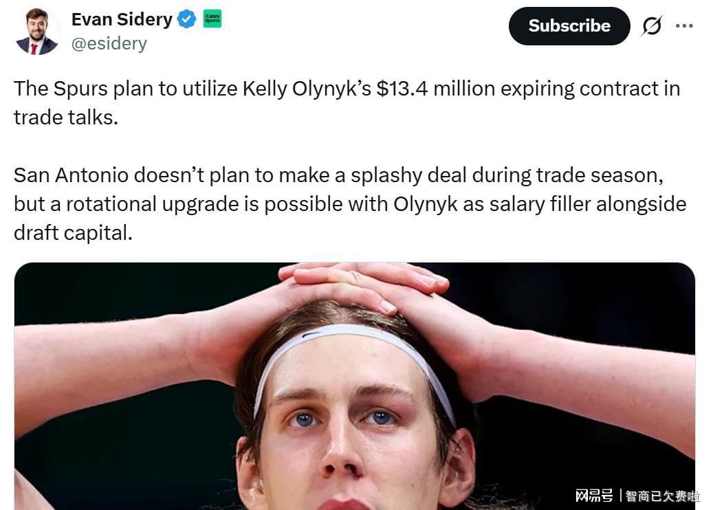 同时马刺队还在延续这一策略,根据名记Evan Sidery报道,马刺队在交易截止日前不会有大动作,他们仅会围绕身背1340万美元到期合同的奥利尼克完成阵容小幅调整。