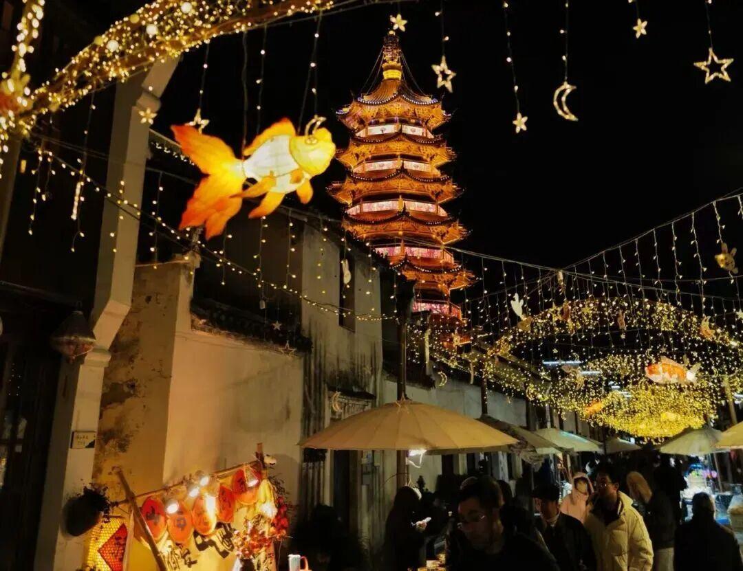 夜晚,整个古镇地区沿街彩灯流转,与节日挂饰串起“光之长廊”,红金交织,烘托出浓浓的新年氛围。