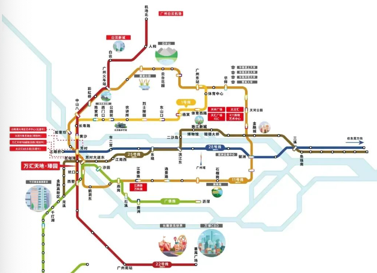 • 3站到黄沙(换6号线),5站抵体育西路 - 规划25号线 + 芳村TOD(11/22号线):1站换乘,11号线为“换乘之王”,26个换乘站,贯通天河、海珠、番禺;