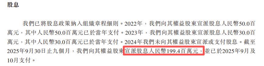 据招股书披露,2022年至2025年9月,SKG累计现金分红高达2.8亿元;其中2025年前三季度,公司当期净利润仅1.06亿元,却突击分红1.994亿元,分红比例高达187%。