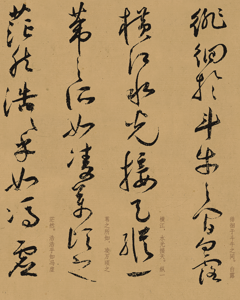 笔画沉劲饱满,提按反差强烈,由重按骤转为轻提,墨色从凝实到飞白自然过渡,如浪涛起伏。转折处圆转方折皆有,强化张力,结字欹正反差,疏密破界,用偏旁错位制造险势,墨法浓枯润燥随文势起伏。