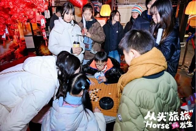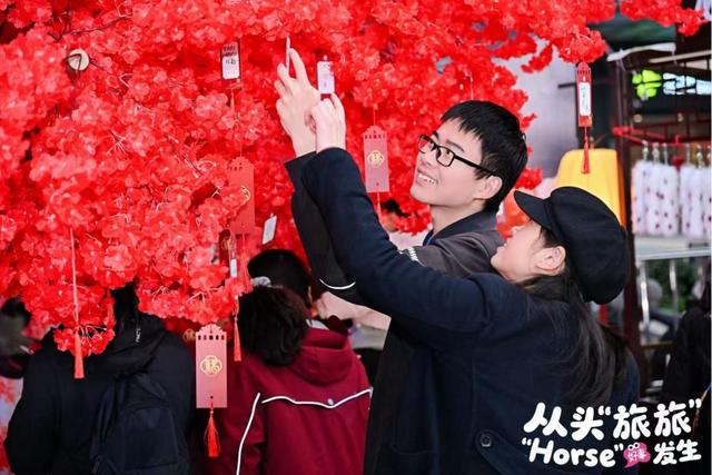 还没走进游园会的大门,就看到带着红黄相间围巾的 大型“开年神马”,以“一马当先”姿态向游客们打招呼。“Horse发生,好事发生。这个谐音梗不错嘛,新年就是要好事连连。”游客冯先生看到门头上“从头‘旅旅’ ‘Horse’(好事)发生”的字样,忍俊不禁。