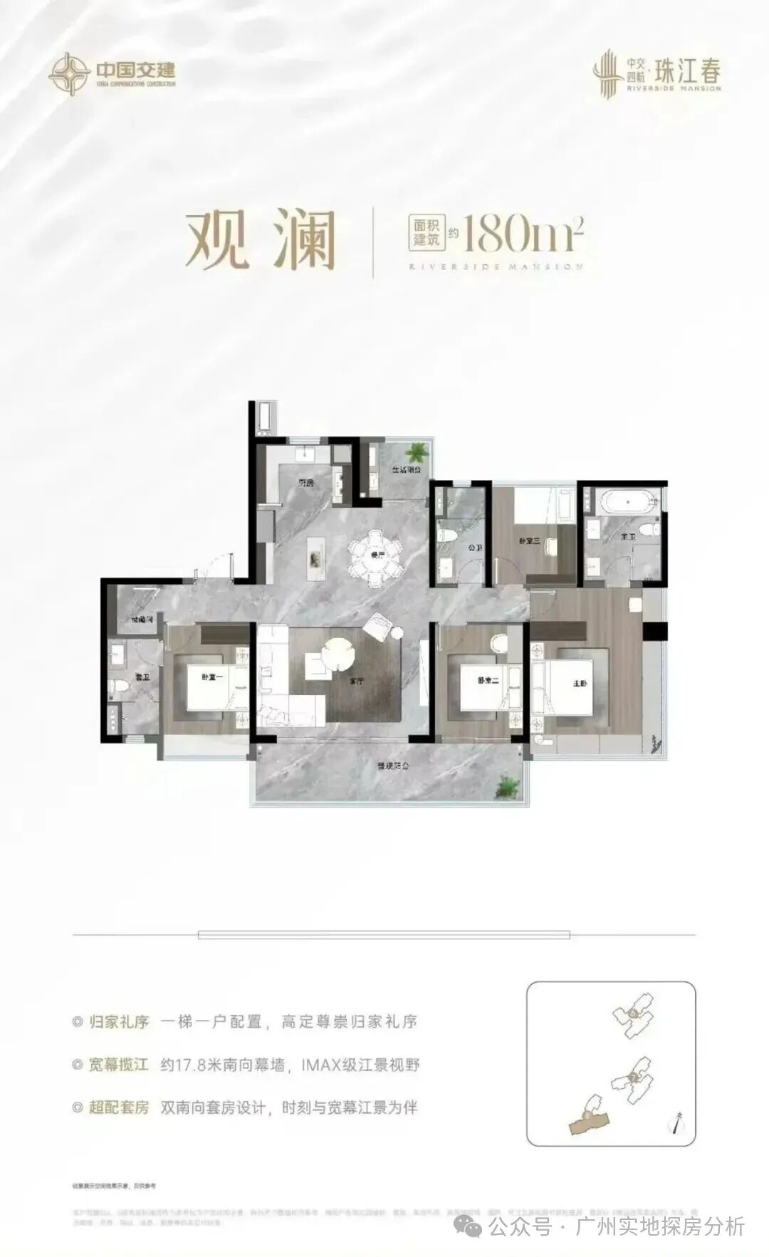 项目首开3地块,共3栋楼。面积130-143-180平使用率超110%。其中6栋43层,7栋47层,8栋45层。6#和7#均为3梯4户8#为3梯3户,户型有130/143平的四房两卫、180平的四房三卫。6#130平B户型为西南向,8#的180平户型南向略略偏东。9#两梯两户大平层,整个项目最近珠江的。6#北侧的小山狮山公园。