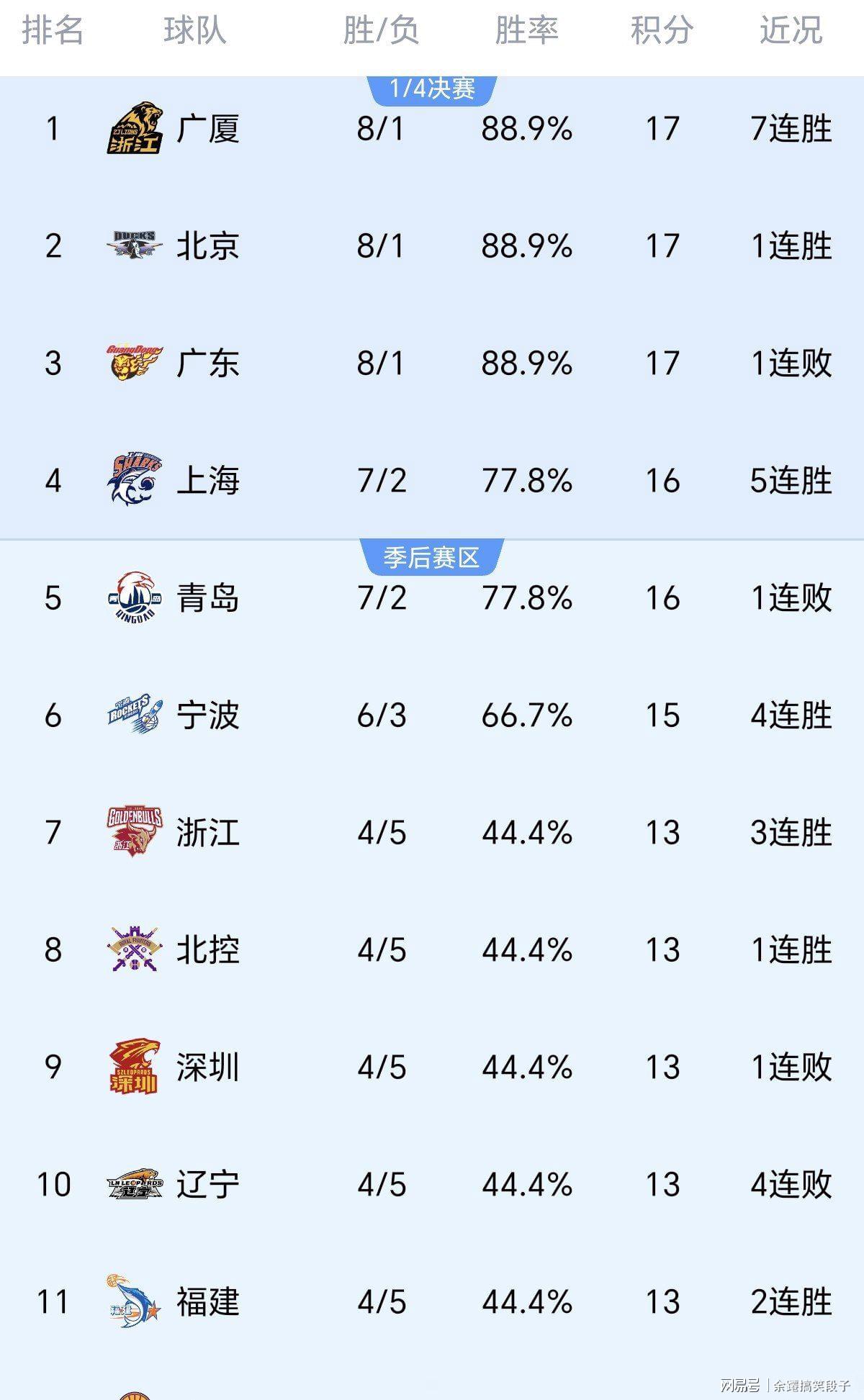 值得一提的是,本赛季曾经难求一胜的排名倒数第二的浙江队,在换帅后战绩回暖,目前一波三连胜之后,一跃重回前八行列来到第7名。而辽宁队则再创新低被挤到第10,在山西、吉林、同曦等队未赛的情况下,辽宁队还有可能持续下跌。
