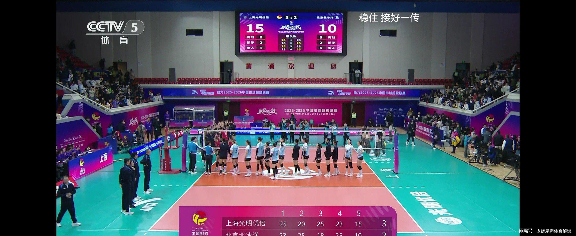 2025-2026中国女排超级联赛A级第六轮新年焦点战,上海光明优倍女排坐镇主场,与北京北冰洋女排展开五局殊死较量,最终以3-2(25-23、20-25、25-18、23-25、15-10) 险胜,斩获新年首胜。
