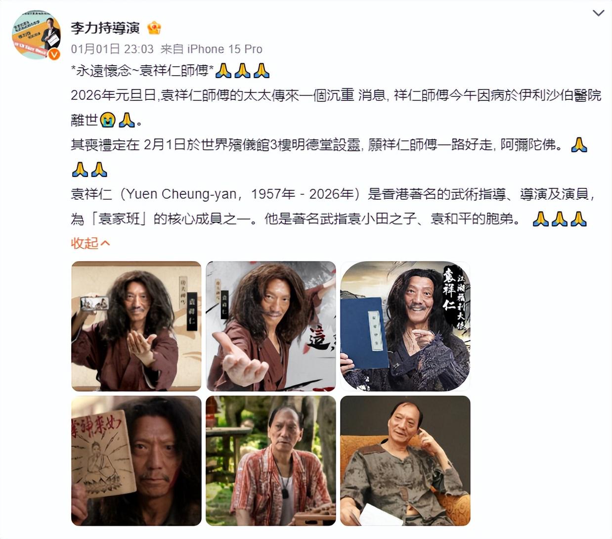 元旦深夜,导演李力持发布了袁祥仁去世的消息。在博文中,李力持写道“永远怀念,袁祥仁师父。2026年元旦,袁祥仁师父的太太传来了一个沉重的消息,祥仁师父在今午因病去世,其丧礼定在2月1日举行”。而博文的最后则贴满了袁祥仁在世的时候出演的角色以及最近的近照。