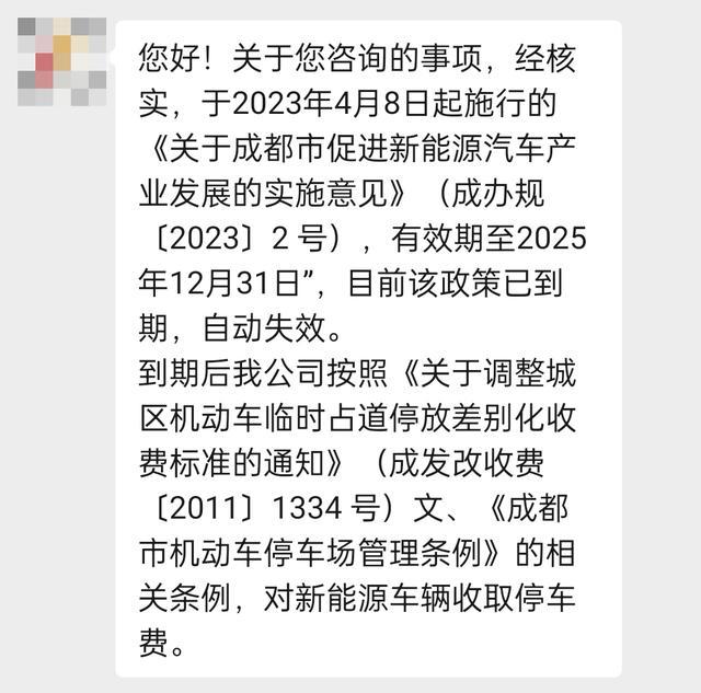 该工作人员表示,在失效后,该公司会按照《关于调整城区机动车临时占道停放差别化收费标准的通知》(成发改收费〔2011〕1334 号)文、《成都市机动车停车场管理条例》的相关条例,对新能源车辆收取停车费。