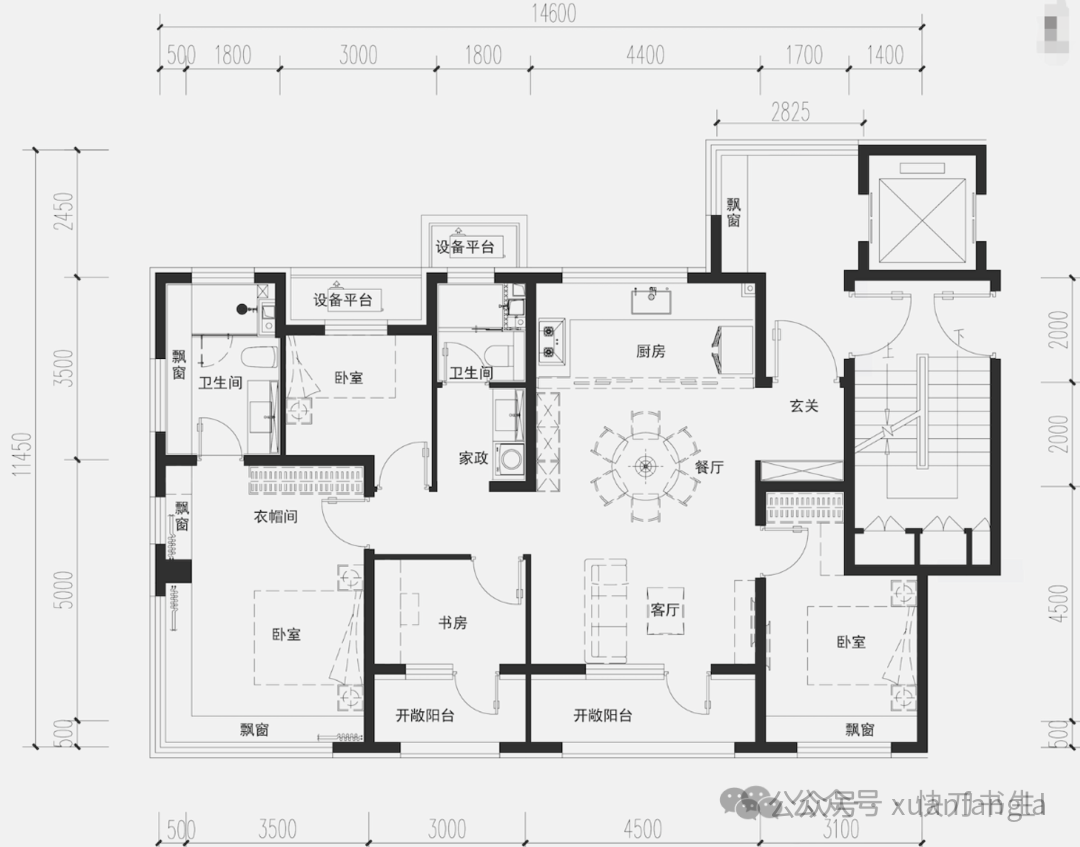 90㎡三居(3室2厅2卫):南向三面宽9.5米,北侧设备平台与南侧阳台双赠送空间依旧保留,增设独立家政间;搭配落地窗+飘窗组合,兼顾采光与空间延展性,满足刚需向刚改过渡的需求。