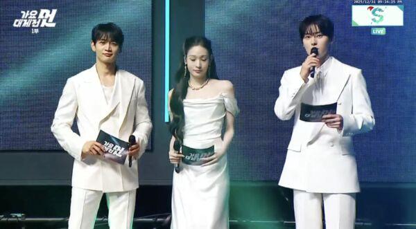 2025年《MBC歌谣大祭典》年末盛典今年迈向20周年,特别以「멋(帅气)」为主题,由SHINee珉豪、黄旼炫以及ALLDAY PROJECT的Annie一起担任主持人,3人穿着全白战袍一同现身,为典礼揭开序幕。
