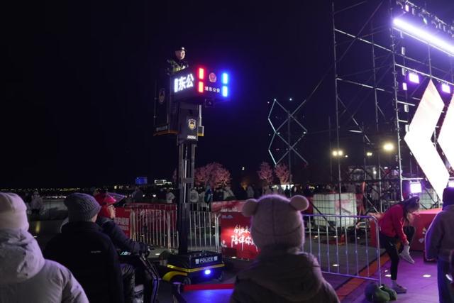 围绕当晚大客流的精准管控,临港新城派出所民警袁超介绍:“我们这次在滴水湖地铁站旁启用了警用升降车,相当于在高空设置了一个‘智慧眼睛’。通过它,指挥中心可以实时掌握各个观赏区域的人流密度和移动趋势。一旦发现局部区域人流过于密集,我们立刻就能通过对讲机,调度最近的地面警力前去引导和分流,实现‘高空监测、地面联动’的快速反应。这套方法让我们的安保工作从‘凭经验’转向‘看数据’,调度更科学,处置也更精准,确保了整场活动既安全又有序。”