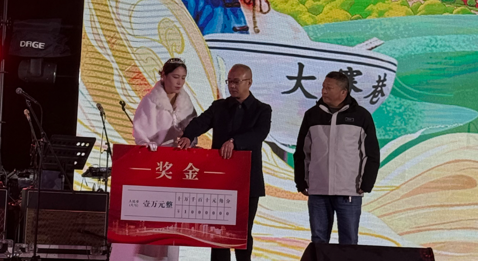 此前,我们曾关注过大赛巷两个娃娃征名的事情,详见文章《》,活动现场,公布大赛巷娃娃征名结果,端着碗的码头工人形象的叫小赛哥,而转角处墙上的娃娃则叫小码哥,并给获奖人颁奖。