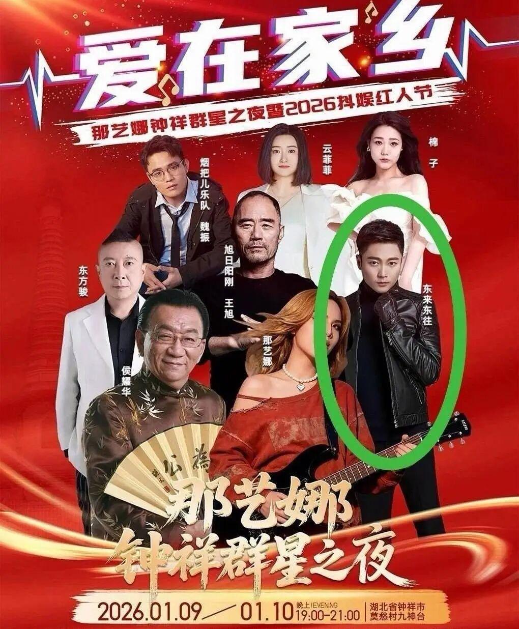 宣传海报显示,这场名为“爱在家乡·那艺娜钟祥群星之夜暨2026抖娱红人节”的晚会,将于2026年1月9日至1月10日晚,在钟祥莫愁村景区上演。