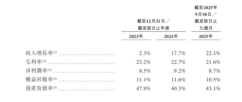 于2023年、2024年及截至2025年9月30日止九个月,公司毛利率分别为23.2%、22.7%、21.6%。