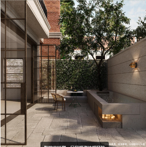 下沉庭院整体长约18米,进深约9.5米,庭院的上下景观通过水帘相连通,中间结合有着层层叠水的水景,搭配水晶砖的景墙,将品质感拉满。