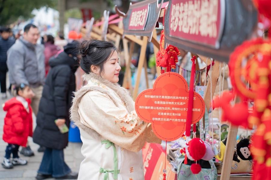 舌尖上的盛宴同样令人流连忘返。“贤城味道”年味文创食集里,鼎丰乳腐、神仙酒、农家方糕等奉贤本土美食香气四溢,网红咖啡、创意烘焙、博物馆文创等潮流好物也齐聚一堂。身着古装的摊主们热情吆喝,与青溪老街的古朴风貌相映成趣,营造出别具一格的“古今对话”市集场景。“青团和方糕卖得最好,很多游客尝过之后,都会买上礼盒带回家。”一位本土美食摊主介绍道。这场味觉盛宴,不仅满足了游客的味蕾,更有效带动了在地消费,让文化价值实实在在转化为经济价值。