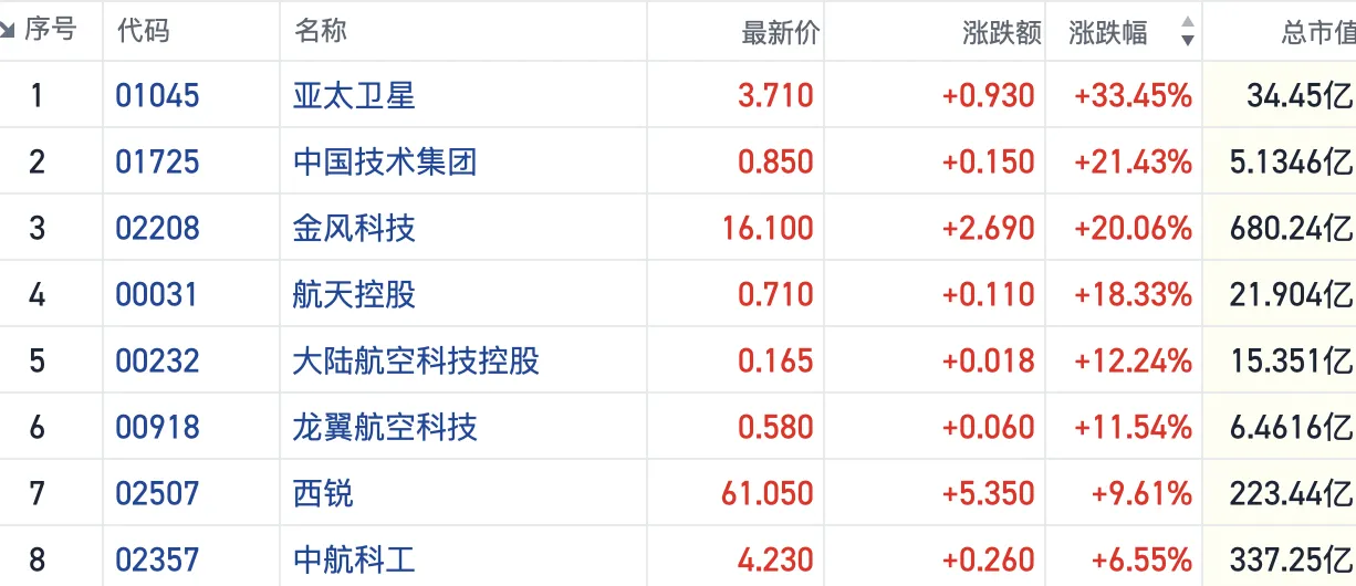 截至发稿,亚太卫星(01045.HK)大涨逾30%,金风科技(02208.HK)、中国技术集团(01725.HK)均涨逾20%,航天控股(00031.HK)等个股也大幅跟涨。