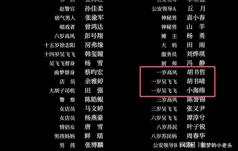 一岁的高风,演员叫胡书哲,而一岁的吴飞飞有两个演员,一个是胡书晴,一个是小海绵。