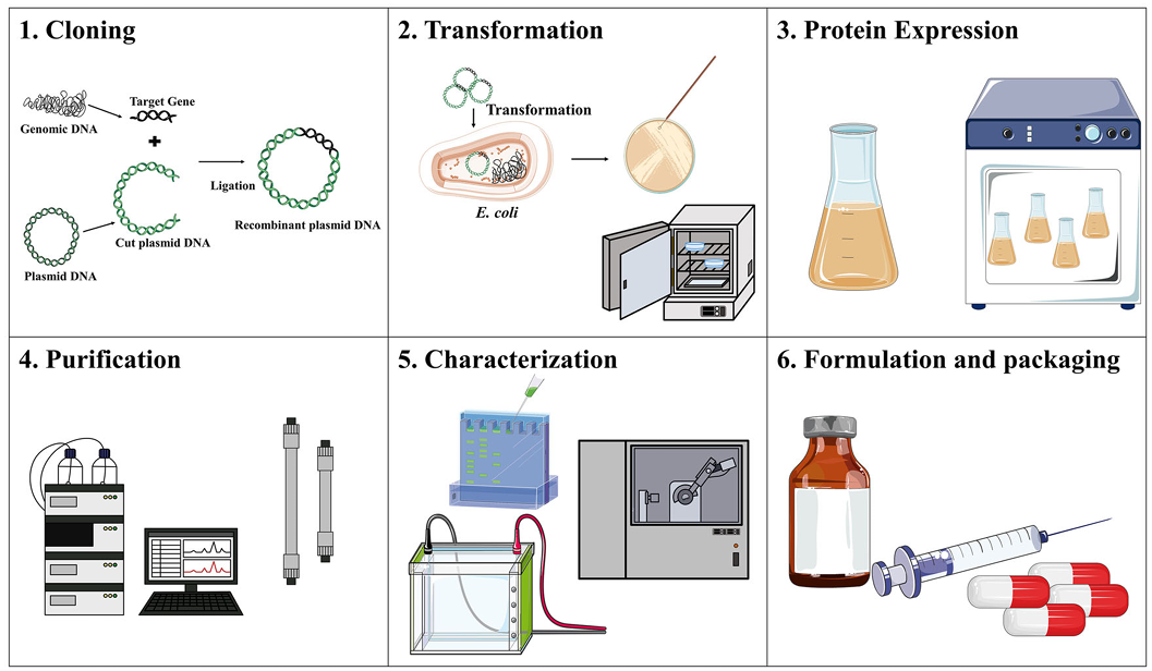 大肠杆菌生产重组生物制药的流程其实并不复杂,主要分为 6 个步骤:克隆目标基因→将重组质粒转入大肠杆菌→诱导蛋白表达→分离纯化蛋白→鉴定蛋白活性→制剂包装,一套流程下来,就能产出合格的生物药物(见图 1)。