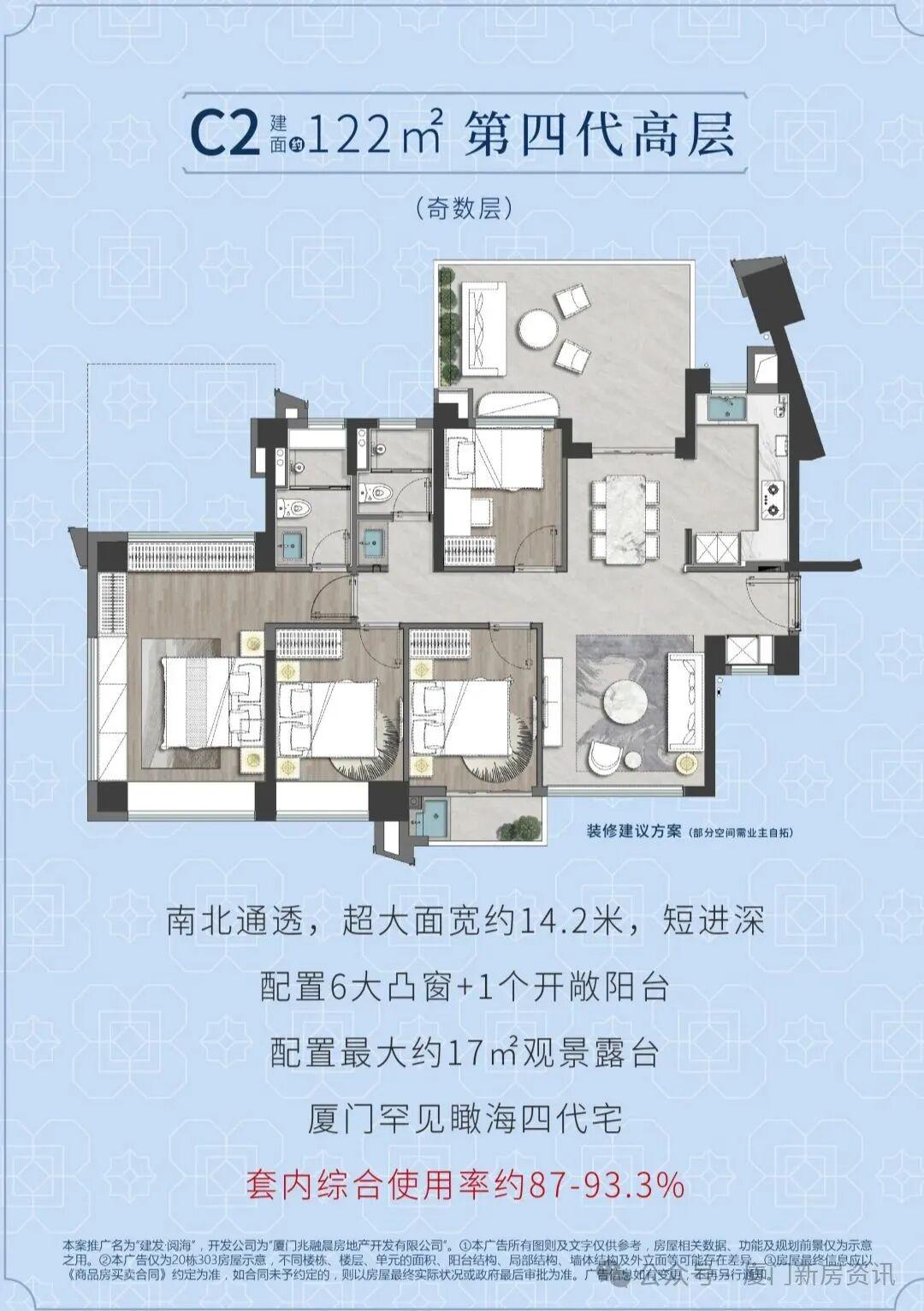 地块分为2个项目。A1地块建发湾墅,综合使用率超200%,终极改善置业,是厦门近十年唯一一个纯别墅住区。A2地块建发阅海项目四代宅(120㎡以上户型)入户花园 ,空中花园,整体综合使用率为87%-108%。