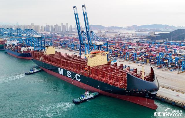 2026年1月1日,在山东港口青岛港,“地中海沙特阿拉伯”集装箱货轮在缓缓靠泊。(张进刚 摄)