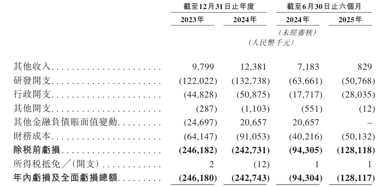 2023年度、2024年度及2025年截至6月30日止六个月,该公司年内亏损及全面亏损总额分别约为2.46亿元、2.43亿元、1.28亿元人民币。