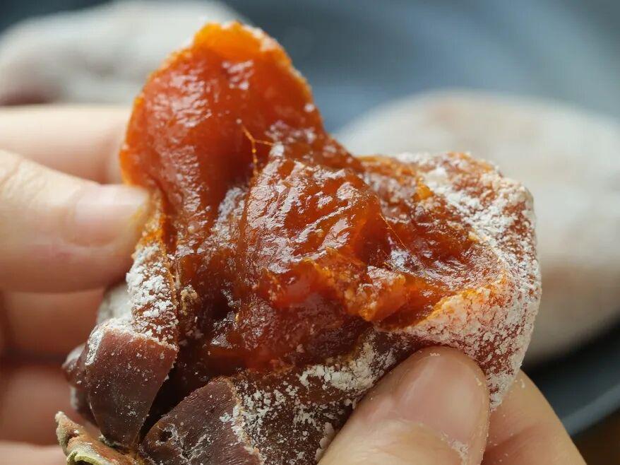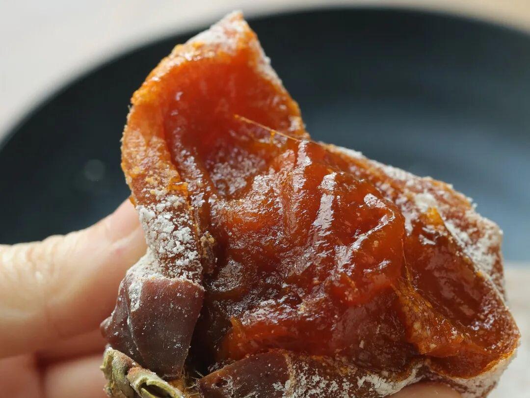若是将柿饼撕开一个小角,就会发现里头是会流动的甜,丝丝入扣......