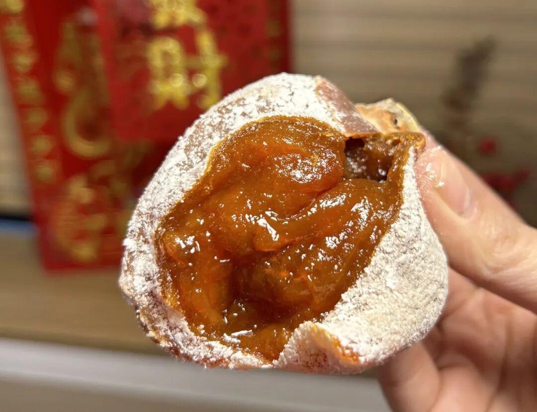 捏开一枚橙红的流心柿饼,琥珀色糖浆缓缓流淌。