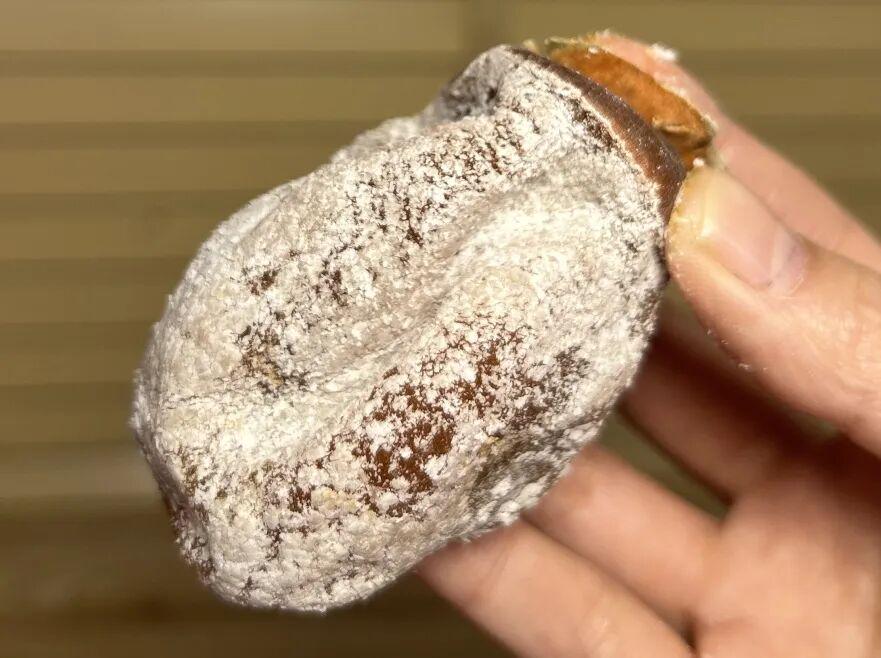 行业里不少商家会在柿饼上撒厚厚的白霜或葡萄糖粉,从而遮掩住柿子自身的缺点。