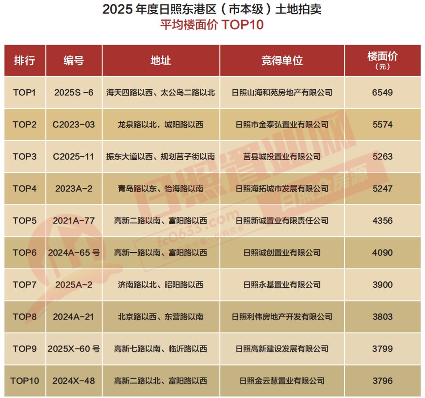 从楼面价看,最高为 2025S -6 号地块,楼面地价约 6549 元 / ㎡。由日照山海和苑房地产有限公司以底价竞得。该地块位于海天四路以西、太公岛二路以北。地块原权属单位:日照钢铁研究院。出让面积:34596.6 平方米。规划指标为:容积率 >1.0且 ≤ 1.1; 绿 地 率 ≥ 30%; 建 筑 密 度≤ 35%。