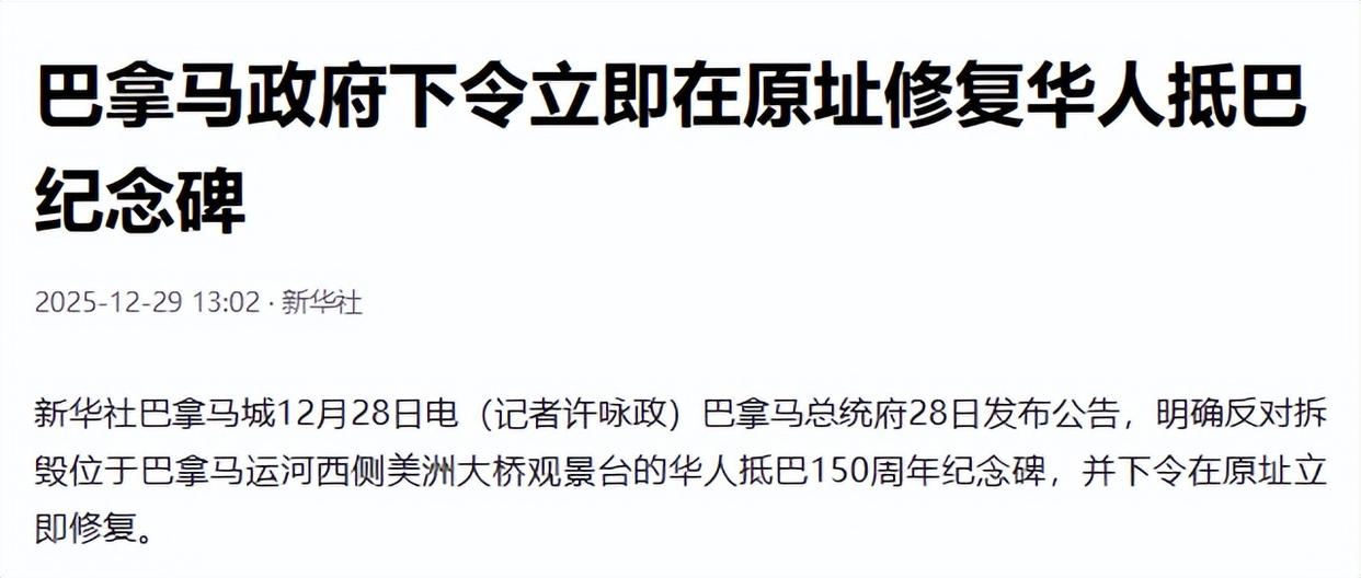 《外交部:中方对巴拿马有关地方政府强拆华人抵巴纪念碑行径严重不满》人民日报2025-12-29 16:21