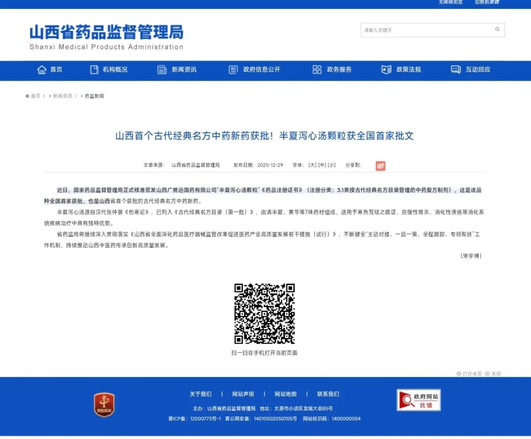 2025年12月22日,山西广誉远国药有限公司正式获得国家药品监督管理局核准签发的“半夏泻心汤颗粒”《药品注册证书》。这一纸批文,不仅标志着山西省首个古代经典名方中药新药诞生,也让广誉远成为该品种全国首家获批企业。