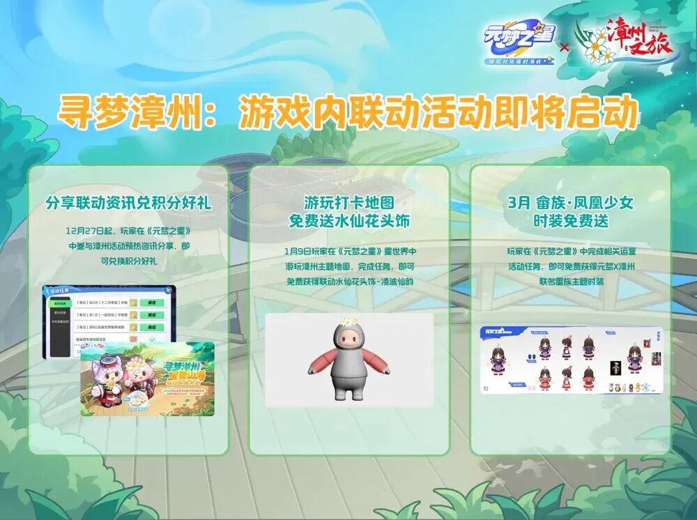 围绕漳州特色文化资源,以漳州古城、东山岛、云水谣、龙江岁月为设计模板,本次联动一口气推出四张充满漳州风情的主题共创地图。在这四张地图里,玩家可以通过操纵游戏角色,在土楼、街巷里“蹦蹦跳跳”,在游戏中感受漳州独特的民俗文化与建筑美学。自1月9日起,所有玩家都能在《元梦之星》里体验“寻梦漳州”主题地图合集,通过完成相关任务,还能免费获取联动定制水仙花头饰“凌波仙韵”。此外,即日起参与漳州主题的资讯分享活动即可兑换积分好礼;3月起,玩家通过完成游戏内任务还可免费获得畲族联名时装“凤凰少女”。