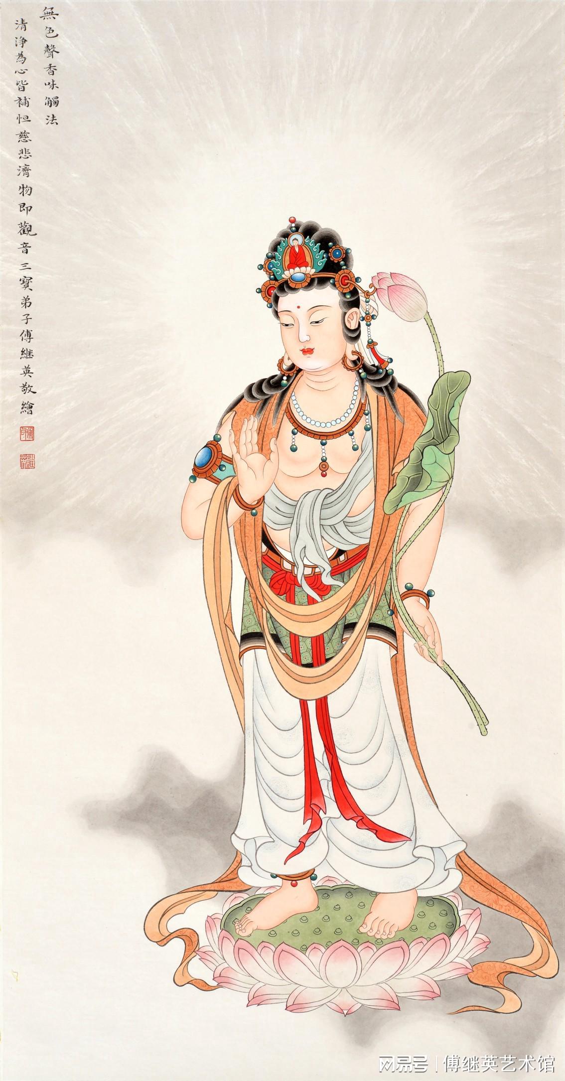数字浪潮席卷的当下,碎片化认知如利刃般割裂着完整的思维图景。通勤途中的仓促览阅、工作场域的零散任务、社交圈层的浅尝辄止,让本应连贯的生活肌理支离破碎,焦虑如影随形,疏离感亦成为现代人心底难以消解的沉疴。当心灵在无尽的喧嚣与追逐中沦为散落的碎片,傅继英老师笔下的观音画,便如荒漠中的一泓清泉、暗夜中的一盏孤灯,构筑成珍贵的精神庇护所。它以浸润东方底蕴的完整与和谐,温柔映照出观者内心的残破与惶惑,更以无声的美学力量,悄然缝合那些被现实撕裂的精神裂隙。
