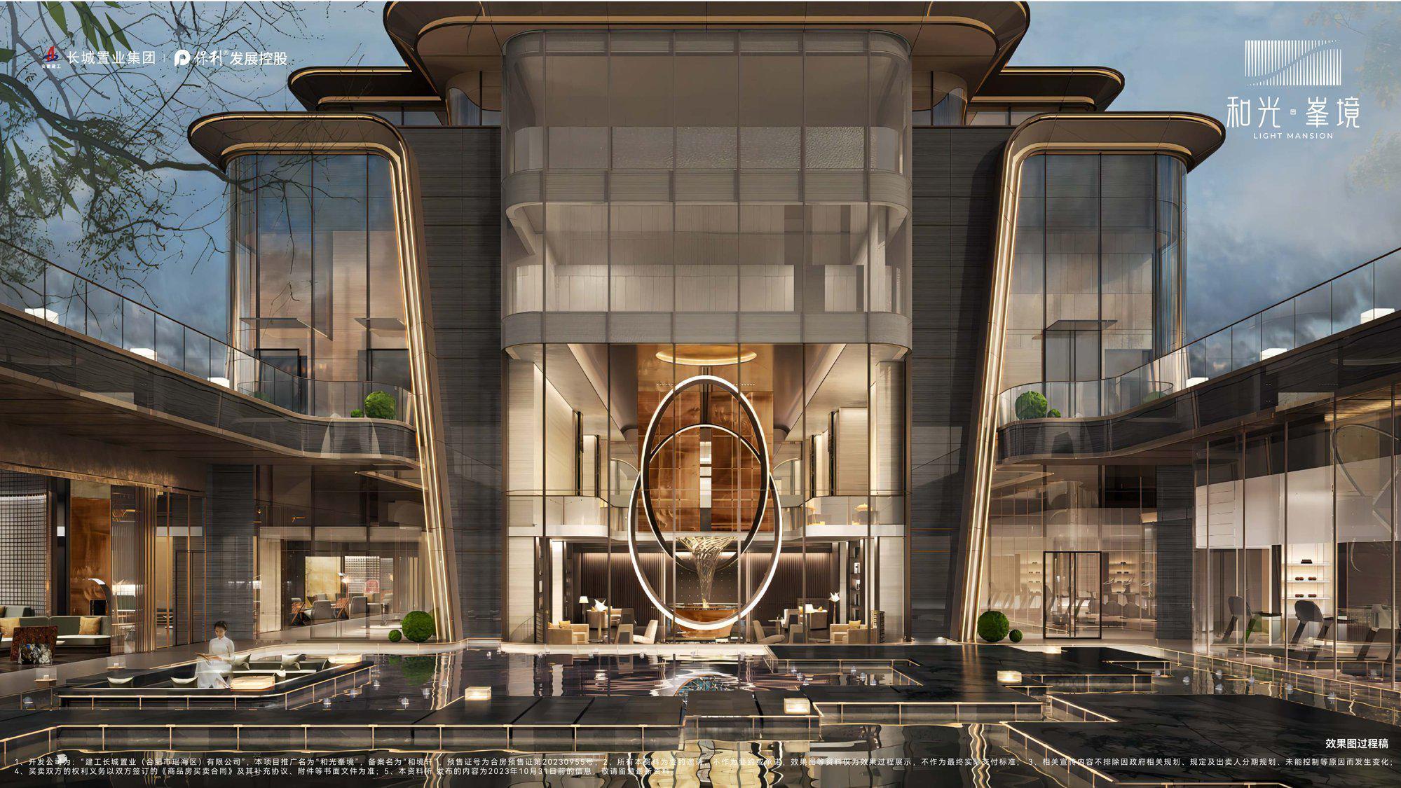 建筑立面是项目的视觉名片,和光峯境采用高窗墙比设计,大幅提升玻璃占比,增强现代感与通透感。灰色石材与金色铝板的材质组合,沉稳而不失奢华,光影交错间彰显高级质感。弧形正面“V”字造型独具辨识度,犹如迎宾之门,寓意开放包容的城市精神。超尺度玻璃体景观面达到约15.5米,将外部美景尽收眼底,同时也让建筑本身成为一道风景线。通透式景观围墙打破传统封闭感,营造轻盈开放的社区界面,增强内外空间的互动性。整体建筑风格摒弃浮华装饰,回归简约纯粹的现代美学,体现“少即是多”的设计理念,契合当代高净值人群对低调奢华、内敛优雅的生活追求。