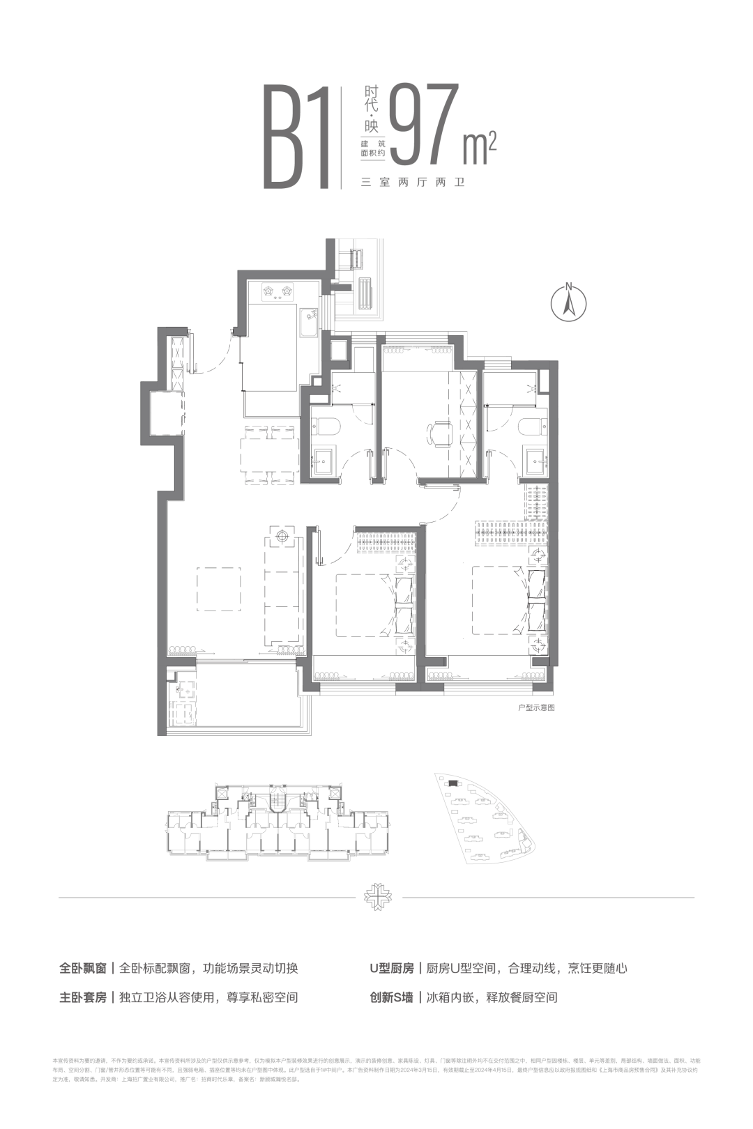 建面约97m²三房两厅两卫户型,全卧+主卫飘窗配置,并通过飞机户型空间布局,提升了空间的使用效率,让温情在自然中自然发生。